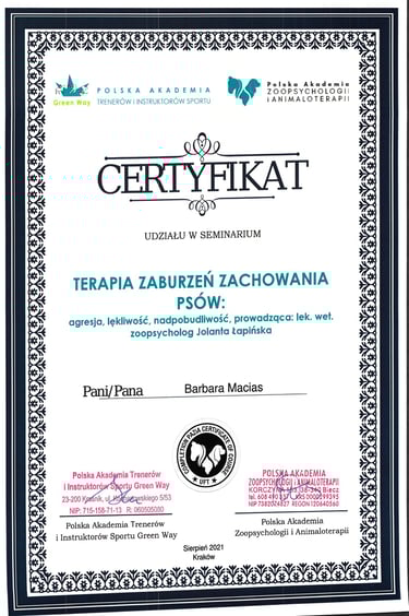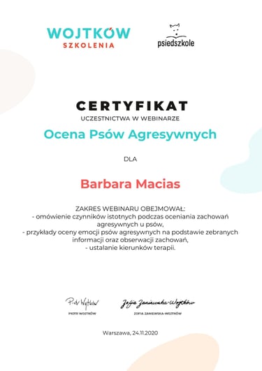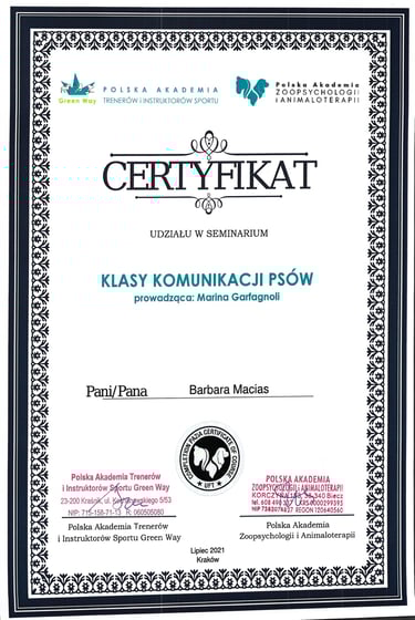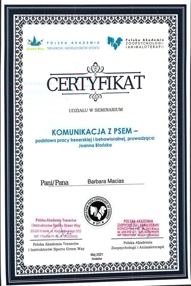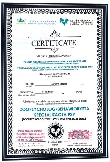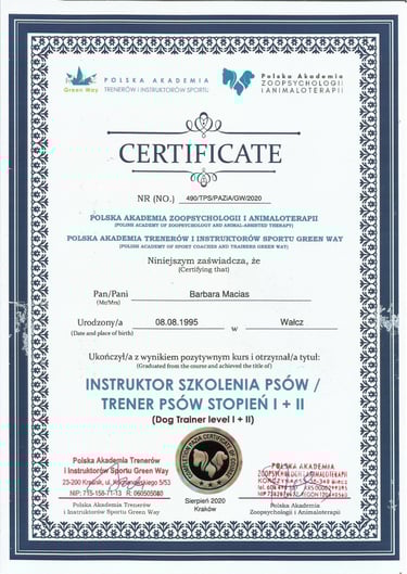 Psy towarzyszyły mi nieustannie, a w międzyczasie ukończyłam studia, gdzie rozwijałam jedną z moich pasji - programowanie. Po opuszczeniu rodzinnego domu bardzo brakowało mi psiaka, dlatego zdecydowałam się na posiadanie kolejnego czworonożnego członka rodziny, a do mojego domu dołączyła suczka rasy Siberian Husky. To ona przypomniała mi, jaką radość sprawia praca z psami od podstaw, dlatego postanowiłam wziąć udział w kursie na psiego trenera, a następnie behawiorystę oraz inne kursy doszkalające.