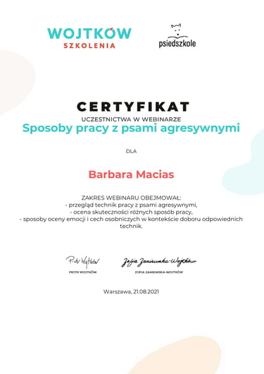 Zawsze byłam miłośniczką psów i od najmłodszych lat chciałam związać swoją przyszłość z nimi. Kiedy byłam dzieckiem, spełniło się moje marzenie o posiadaniu psa, a ja stałam się szczęśliwą opiekunką szczeniaka rasy maltańczyk, z którym spędzałam każdą wolną chwilę. Dzięki pracy w salonie groomerskim miałam okazję poznać wiele różnych psiaków, a dla niektórych z nich prowadziłam nawet hotel.